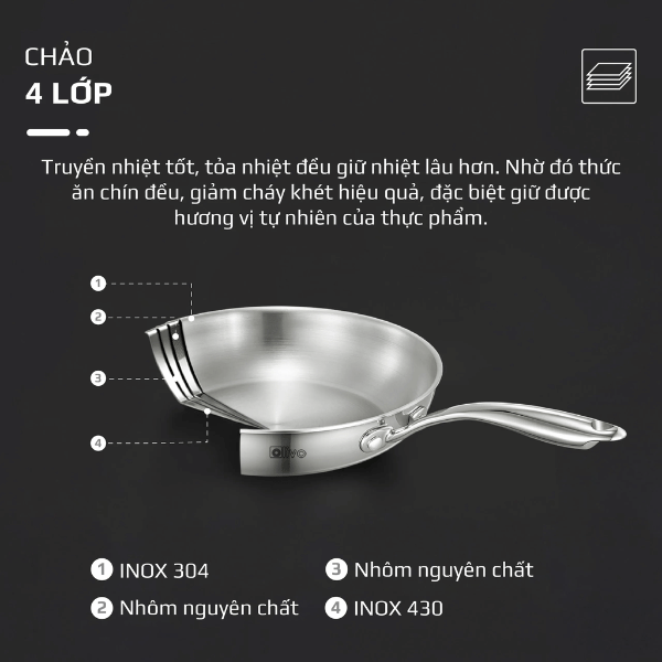 Cấu tạo 4 lớp inox – nhôm – inox cao cấp, giúp dẫn nhiệt nhanh, tỏa đều khắp đáy và thành chảo, hạn chế cháy khét và giữ hương vị nguyên bản của thực phẩm.