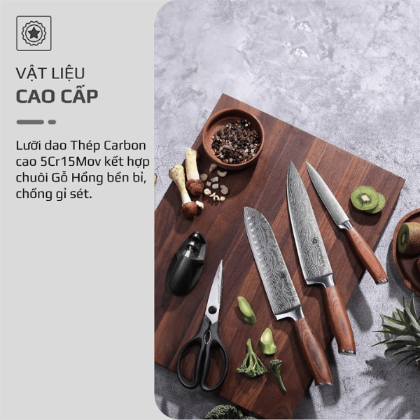 Cán dao giả gỗ chắc chắn, cầm êm tay, hạn chế trơn trượt, mang lại cảm giác an toàn và thoải mái khi nấu nướng. Kiểu dáng sang trọng, phù hợp làm quà tặng hoặc sử dụng lâu dài trong gia đình.