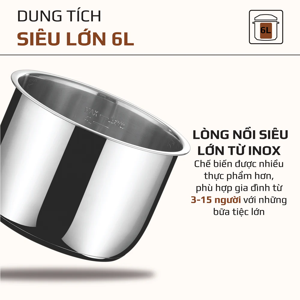 Dung tích lớn 6L giúp người sử dụng có thể chiến biến lượng thực phẩm nhiều hơn, đảm bảo phù hợp với những gia đình đông người có số lượng từ 6-8 người.