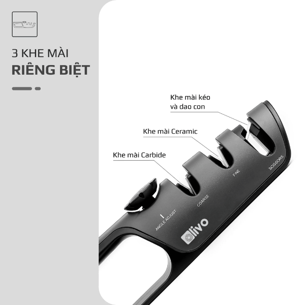 1. 3 KHE MÀI DAO, KÉO TIỆN LỢI ĐÁP ỨNG MỌI YÊU CẦU SỬ DỤNGOLIVO KS1 là dụng cụ mài dao kéo thiết kế cố định với 3 lưỡi mài đáp ứng nhiều nhu cầu sử dụng. Khe mài số 1: khe mài Carbide có tác dụng làm sắc bén lưỡi dao và khôi phục lại đầu cắt chữ V.Khe mài số 2: khe mài Ceramic (gốm) được dùng với mục đích loại bỏ gờ trên lưỡi dao và đánh bóng lưỡi dao.Khe mài số 3: khe mài kéo giúp làm sắc bén lưỡi kéo, phù hợp cho nhiều kích thước kéo khác nhau và dao con.