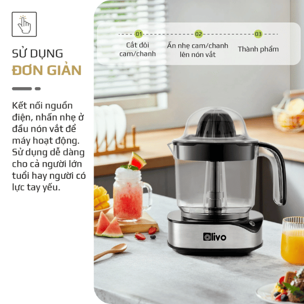 4. THAO TÁC SỬ DỤNG ĐƠN GIẢN Sau khi kết nối nguồn điện, chỉ cần nhấn nhẹ ở đầu nón vắt để máy hoạt động. Có thể vắt bằng 1 tay tiện lợi, dễ sử dụng với cả người lớn tuổi hay người có lực tay yếu. Khi muốn máy dừng hoạt động chỉ cần ngừng tác động lực lên nón vắt. Bước 1: Cắt đôi quả Cam/Chanh. Bước 2: Ấn nhẹ Cam/Chanh lên nón vắt. Bước 3: Rót thành phẩm ra ly và thưởng thức.