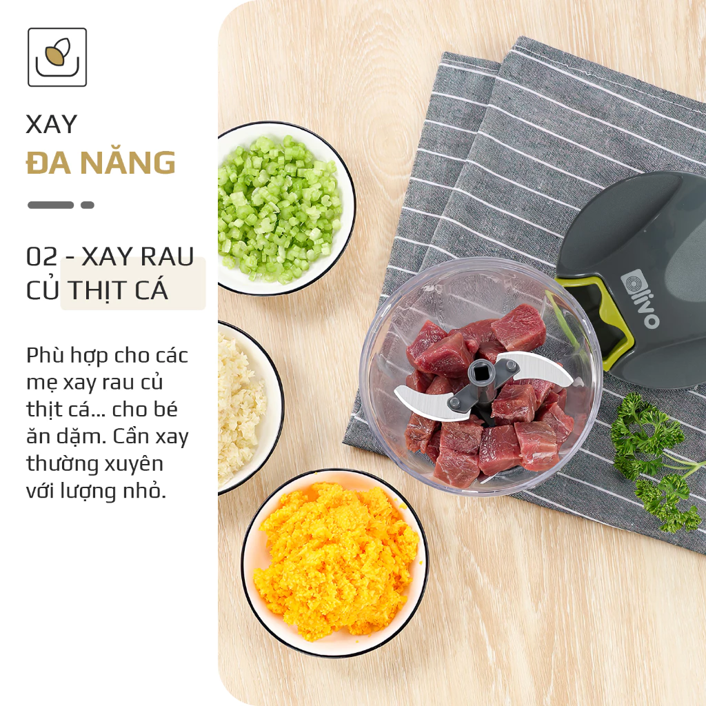 - Đa chức năng: Xay gia vị tỏi ớt dễ dàng và tiện lợi. Ngoài ra các mẹ có thể dùng xay thực phẩm như tôm, thịt, cá cho bé với lượng vừa ăn. Sử dụng không cần cắm điện, dùng xây kéo tiện lợi.
