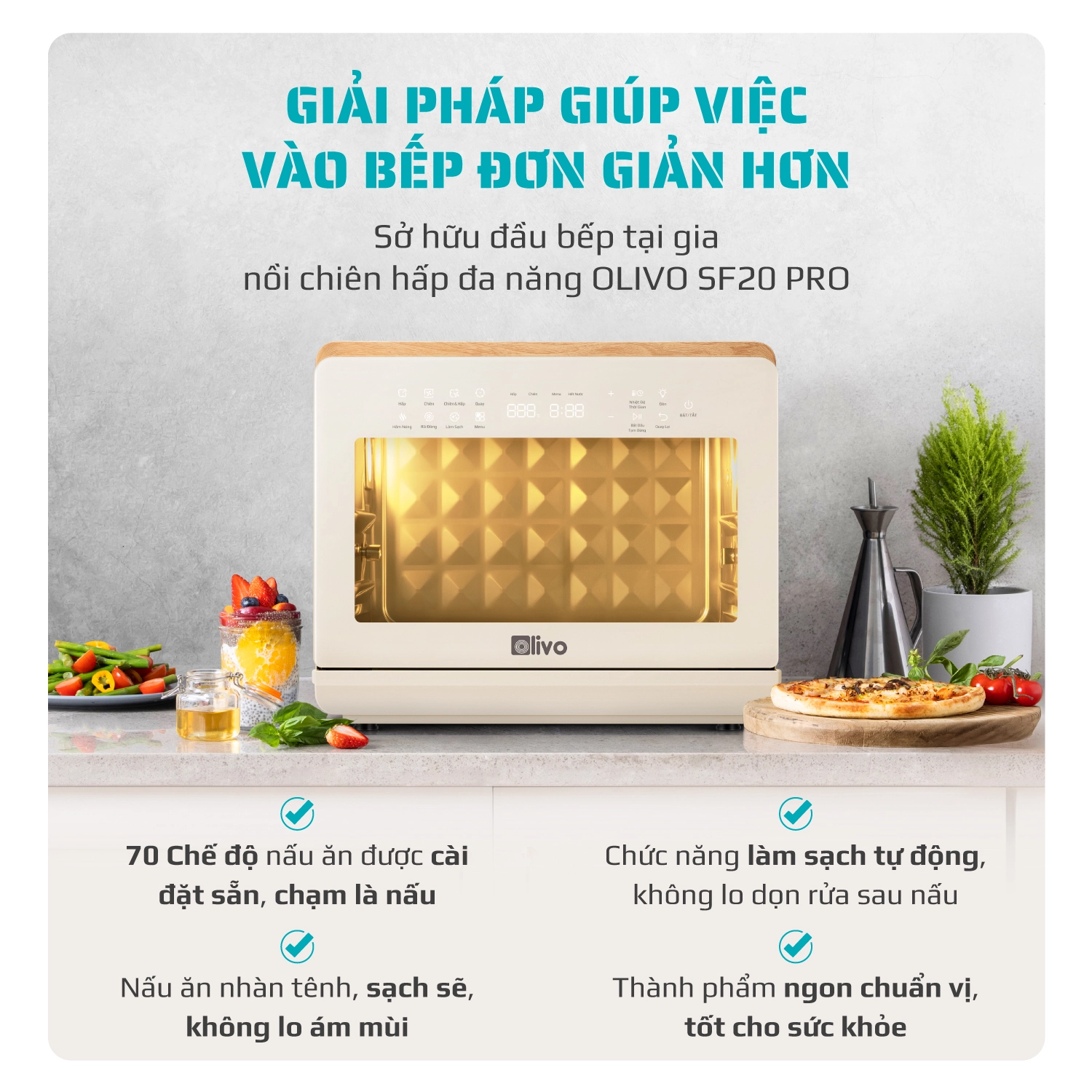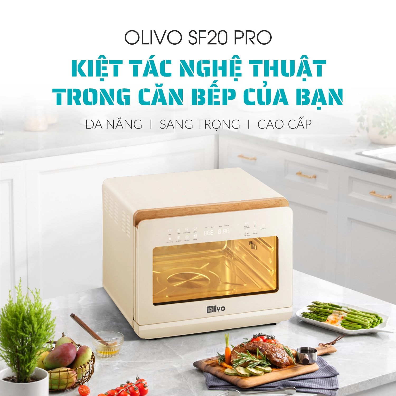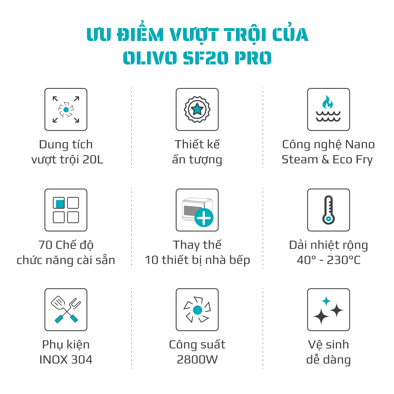 Olivo SF20 pro Dung tích nồi chiên lớn 20L:-Nướng gà/vịt nguyên con, nấu được nhiều món cùng lúc Công nghệ chiên không dầu 360°-Giảm đến 80–90% dầu mỡ, tốt cho sức khỏe Công suất mạnh mẽ-SF20 Pro 1800W chiên nướng nhanh; K37 800W xay mịn hiệu quả Bảng điều khiển cảm ứng thông minh: Màn hình LED rõ nét, dễ sử dụng